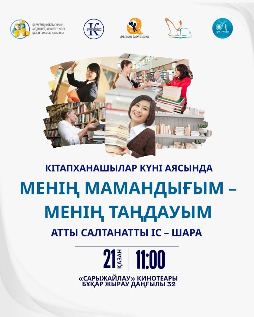 21 октября 2025 года в 11:00 при поддержке управления культуры, архивов и документации Карагандинской области в зале кинотеатра «Сарыжайлау» состоится праздничное мероприятие «Моя профессия – мой выбор», посвящённое профессиональному празднику библиотекарей.